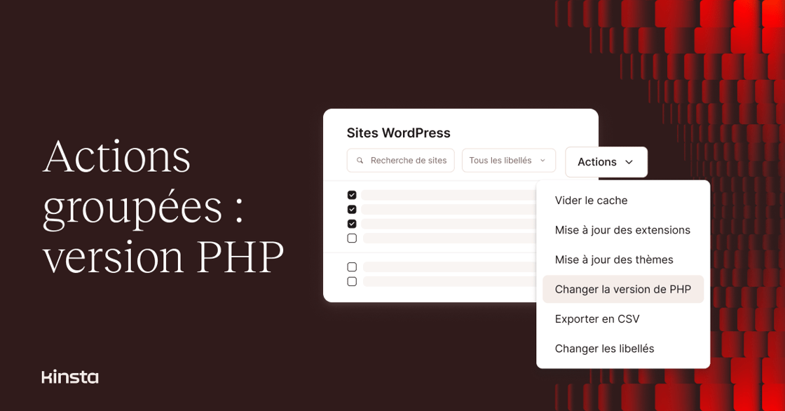 Nous avons simplifié la gestion de vos sites sur MyKinsta ! Maintenant, vous pouvez rapidement mettre à jour les versions PHP sur plusieurs sites WordPress en quelques clics. Cette mise à niveau fait partie de la fonctionnalité Actions groupées qui vous permet déjà de :